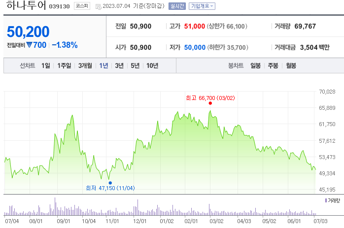 이 글에서는 하나투어 주가 전망과 목표 주가, 기업 정보에 대해서 설명합니다. 주식투자 전에 기업의 상태와 주가 정보에 대해서 살펴보는 것은 굉장히 중요합니다. 하나투어 주식의 주요 현황과 투자 정보를 확인하시고 현재 시장에서의 위치를 분석해보겠습니다.