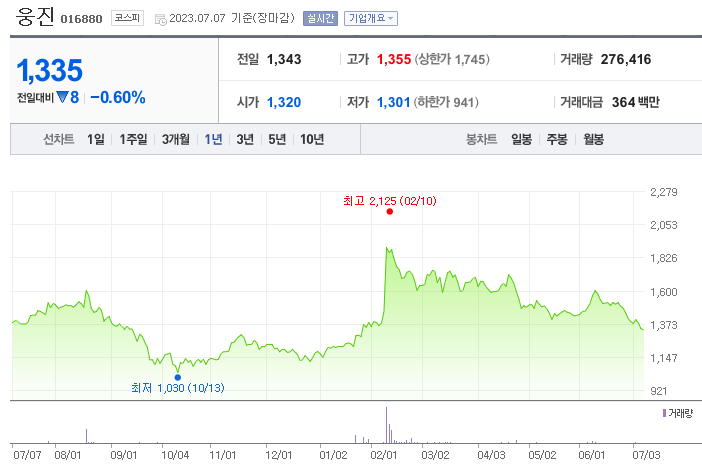 -2007년 투자사업과 교육문화사업 등을 분리하여 동사를 존속법인으로 하고 웅진씽크빅을 신설법인으로 하는 인적분할을 실시하였으며, 상호를 웅진홀딩스로 변경함. 코웨이, 웅진식품, 웅진케미칼의 지분 매각을 통해 2014년 회생절차 종결 결정을 받았으며, 2015년 3월 상호를 웅진으로 변경함. 웅진그룹은 총 16개의 계열사(국내 14, 해외 2)가 있음. 웅진에너지는 2022년 법원으로부터 파산선고를 받아 관련 절차가 진행되고 있음.