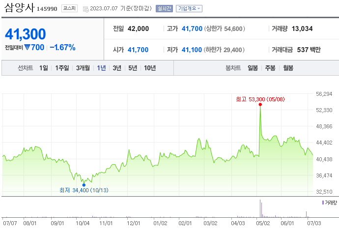 외국인 보유 비중은 13,066% 이며 장중 거래량은 10,313,449를 기록했습니다. 매출액은 6,521억 원, 영업이익은 820억 원을 달성했습니다. EPS는 없음원이며 삼양사 주식 배당수익률은 3.24% 입니다.