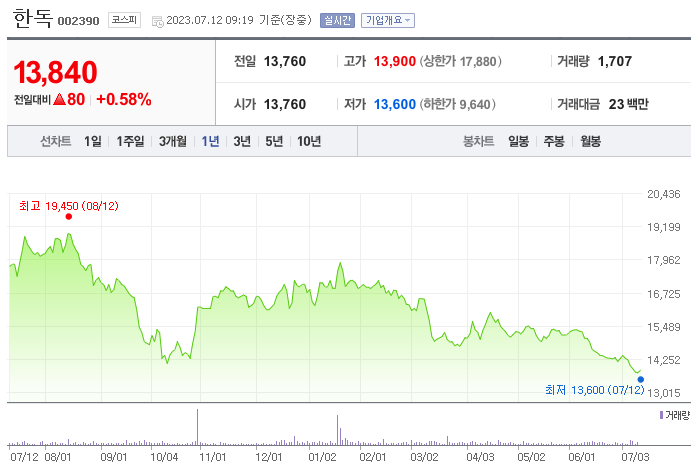 한독 현재 주가는 13,900원이며 전일 대비 -110원의 모습을 보이고 있습니다. 한독의 주주현황을 살펴보면 김영진(외 10인)이 지분 43.38%를 소유하고 있습니다. 한독는 제약 기업으로 장중 기준으로 주가는 13,900원 입니다. 한독의 시가 총액은 1913억 원이며 발행 주식수는 1.35주 입니다.