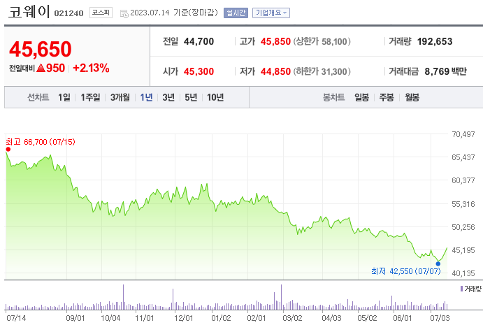 이 글에서는 코웨이 주가 전망과 목표 주가, 기업 정보에 대해서 설명합니다. 주식 투자를 하려면 기업 정보를 확인하고 주가 정보에 대해 분석하는 것이 필요합니다. 코웨이 주식의 주요 현황과 투자 정보를 확인하시고 주가 흐름을 파악해보겠습니다.