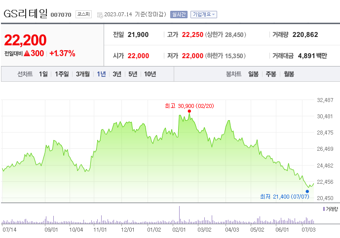 GS리테일 현재 주가는 22,200원이며 전일 대비 -7.11원의 모습을 보이고 있습니다. GS리테일의 주주현황을 살펴보면 GS(외 1인)이 지분 57.90%를 소유하고 있습니다. GS리테일는 도소매 기업으로 장중 기준으로 주가는 22,200원 입니다. GS리테일의 시가 총액은 2조3247억 원이며 발행 주식수는 7.69주 입니다.