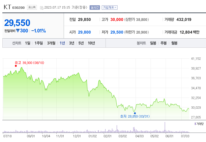 이 글에서는 KT 주가 전망과 목표 주가, 기업 정보에 대해서 설명합니다. 주식을 알아보기 전에 기업의 현재 주가와 재무 상태에 관해서 알아보는 것은 아주 중요합니다. KT 주식의 주요 현황과 투자 정보를 확인하시고 주가 현황을 시장에 맞춰서 분석해보겠습니다.