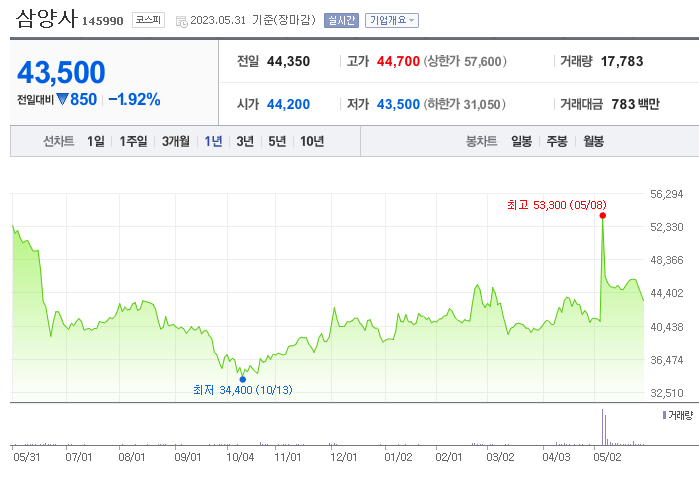 외국인 보유 비중은 22,986%이며 장중 거래량은 10,313,449를 기록했습니다. 매출액은 6,521억 원, 영업이익은 820억 원을 달성했습니다. EPS는 없음원이며 삼양사 주식 배당수익률은 3.24%입니다.