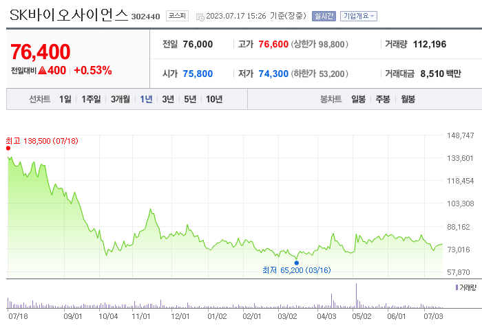 SK바이오사이언스 현재 주가는 76,000원이며 전일 대비 -5.82원의 모습을 보이고 있습니다. SK바이오사이언스의 주주현황을 살펴보면 에스케이케미칼(외 2인)이 지분 68.24%를 소유하고 있습니다. SK바이오사이언스는 제약 기업으로 장중 기준으로 주가는 76,000원 입니다. SK바이오사이언스의 시가 총액은 5조8356억 원이며 발행 주식수는 4.74주 입니다.