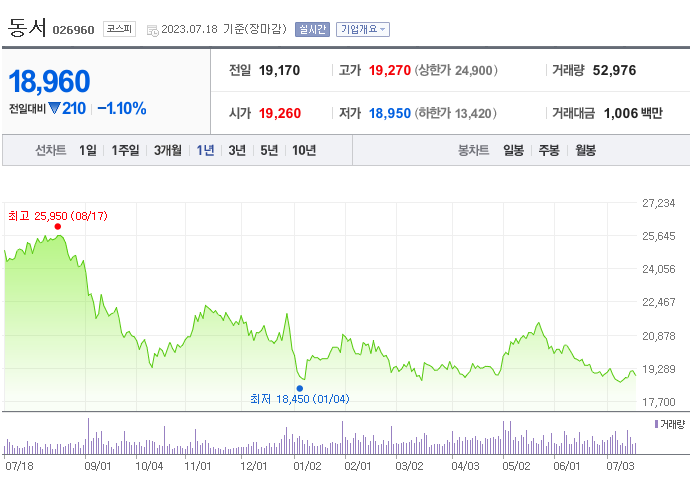 외국인 보유 비중은 82,738% 이며 장중 거래량은 99,700,000를 기록했습니다. 매출액은 1,238억 원, 영업이익은 392억 원을 달성했습니다. EPS는 없음원이며 동서 주식 배당수익률은 3.61% 입니다.