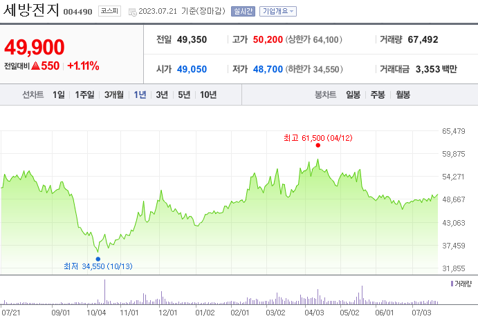 이 글에서는 세방전지 주가 전망과 목표 주가, 기업 정보에 대해서 설명합니다. 주식을 알아보기 전에 정확한 기업 정보와 주가 현황에 대해 정리해보는 것은 아주 중요합니다. 세방전지 주식의 주요 현황과 투자 정보를 확인하시고 주가 흐름을 파악해보겠습니다.