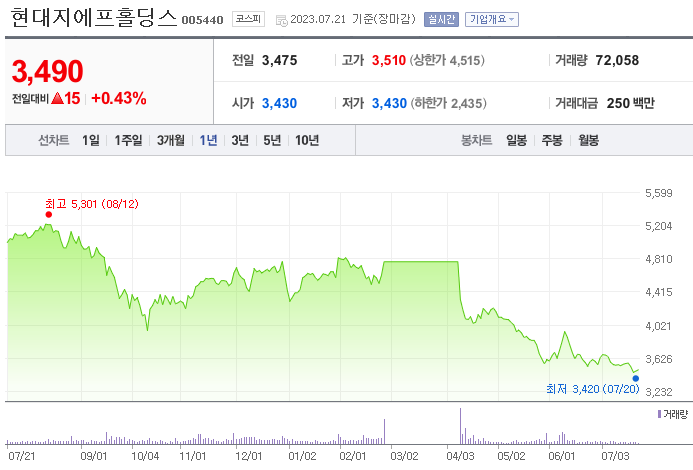 외국인 보유 비중은 69,123% 이며 장중 거래량은 63,823,568를 기록했습니다. 매출액은 4,960억 원, 영업이익은 600억 원을 달성했습니다. EPS는 251원이며 현대지에프홀딩스 주식 배당수익률은 2.22% 입니다.