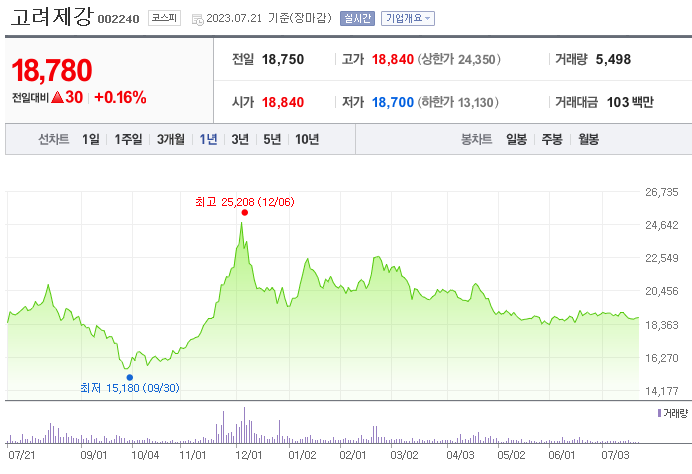 외국인 보유 비중은 9,689% 이며 장중 거래량은 25,000,000를 기록했습니다. 매출액은 4,460억 원, 영업이익은 1,335억 원을 달성했습니다. EPS는 없음원이며 고려제강 주식 배당수익률은 20,613,736% 입니다.