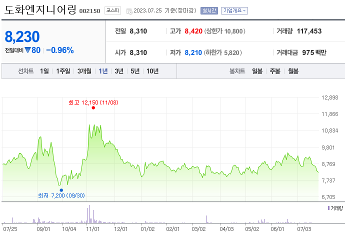 외국인 보유 비중은 140,832% 이며 장중 거래량은 33,720,000를 기록했습니다. 매출액은 1,196억 원, 영업이익은 119억 원을 달성했습니다. EPS는 없음원이며 도화엔지니어링 주식 배당수익률은 1.42% 입니다.