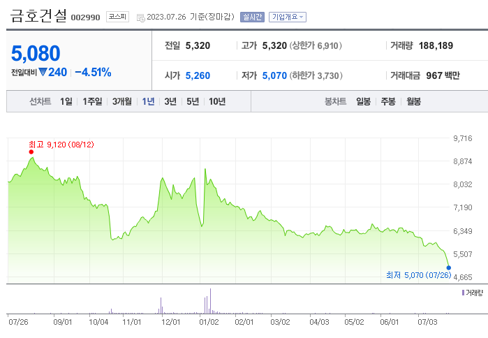 이 글에서는 금호건설 주가 전망과 목표 주가, 기업 정보에 대해서 설명합니다. 주식을 사기 전에 기업 현황고 현재 시장 흐름에 대해서 살펴보는 것이 중요합니다. 금호건설 주식의 주요 현황과 투자 정보를 확인하시고 현재 시장 현황을 살펴보겠습니다.
