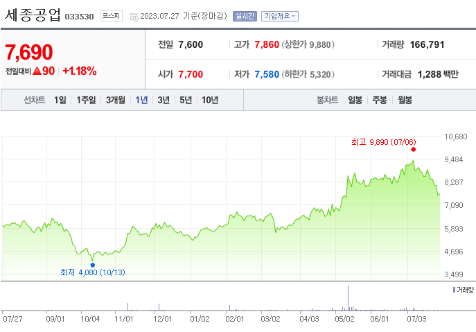 외국인 보유 비중은 259,618% 이며 장중 거래량은 27,820,961를 기록했습니다. 매출액은 4,815억 원, 영업이익은 321억 원을 달성했습니다. EPS는 없음원이며 세종공업 주식 배당수익률은 957,736% 입니다.