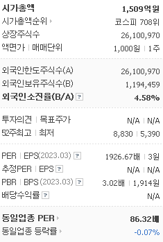 외국인 보유 비중은 97,393% 이며 장중 거래량은 26,100,970를 기록했습니다. 매출액은 215억 원, 영업이익은 -31억 원을 달성했습니다. EPS는 없음원이며 동성제약 주식 배당수익률은 20.99% 입니다.