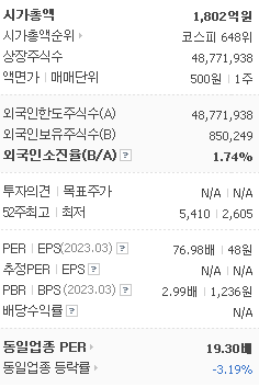 외국인 보유 비중은 814,913% 이며 장중 거래량은 48,771,938를 기록했습니다. 매출액은 372억 원, 영업이익은 31억 원을 달성했습니다. EPS는 없음원이며 퍼스텍 주식 배당수익률은 3.59% 입니다.