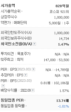외국인 보유 비중은 3,209% 이며 장중 거래량은 1,000,000를 기록했습니다. 매출액은 1,216억 원, 영업이익은 -0억 원을 달성했습니다. EPS는 없음원이며 금비 주식 배당수익률은 -2.82% 입니다.