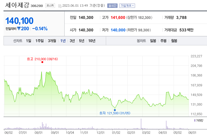 세아제강 현재 주가는 143,400원이며 전일 대비 -1,800원의 모습을 보이고 있습니다. 세아제강의 주주현황을 살펴보면 세아제강지주(외 7인)가 지분 62.76%를 소유하고 있습니다. 세아제강은 금속 및 광물 기업으로 장중 기준으로 주가는 143,400원입니다. 세아제강의 시가 총액은 3991억 원이며 발행 주식수는 11.19주입니다.