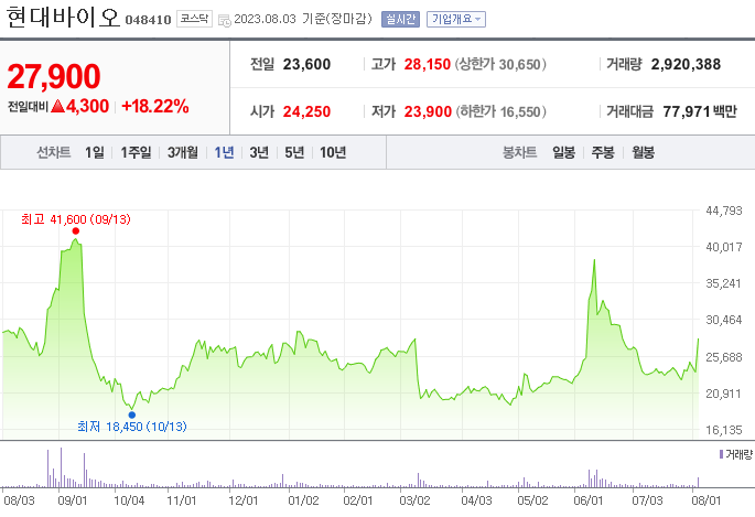 외국인 보유 비중은 371,196% 이며 장중 거래량은 39,804,508를 기록했습니다. 매출액은 32억 원, 영업이익은 -264억 원을 달성했습니다. EPS는 없음원이며 현대바이오 주식 배당수익률은 4,412,161% 입니다.