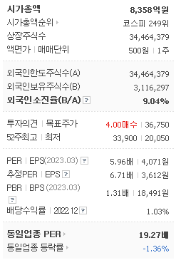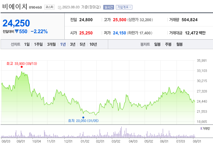 외국인 보유 비중은 607,957% 이며 장중 거래량은 34,464,379를 기록했습니다. 매출액은 3,139억 원, 영업이익은 1,313억 원을 달성했습니다. EPS는 3,637원이며 비에이치 주식 배당수익률은 8,375% 입니다.