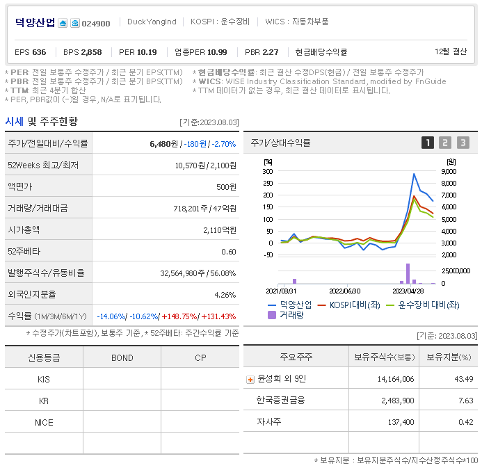 외국인 보유 비중은 700,563% 이며 장중 거래량은 32,564,980를 기록했습니다. 매출액은 4,321억 원, 영업이익은 307억 원을 달성했습니다. EPS는 없음원이며 덕양산업 주식 배당수익률은 10.85% 입니다.