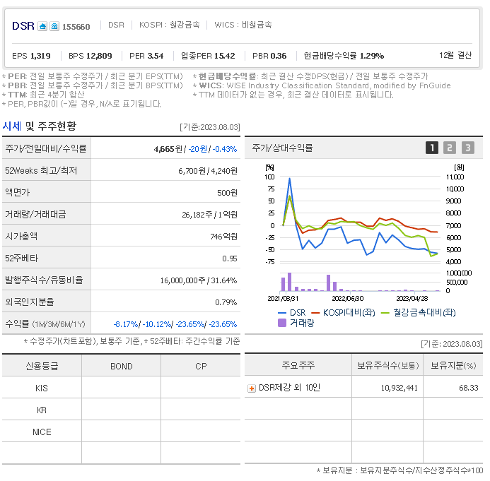DSR 현재 주가는 4,680원이며 전일 대비 -8.59원의 모습을 보이고 있습니다. DSR의 주주현황을 살펴보면 DSR제강(외 10인)이 지분 68.33%를 소유하고 있습니다. DSR는 금속 및 광물 기업으로 장중 기준으로 주가는 4,680원 입니다. DSR의 시가 총액은 760억 원이며 발행 주식수는 0.83주 입니다.