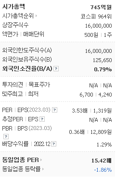 외국인 보유 비중은 37,498% 이며 장중 거래량은 16,000,000를 기록했습니다. 매출액은 714억 원, 영업이익은 358억 원을 달성했습니다. EPS는 없음원이며 DSR 주식 배당수익률은 3.45% 입니다.