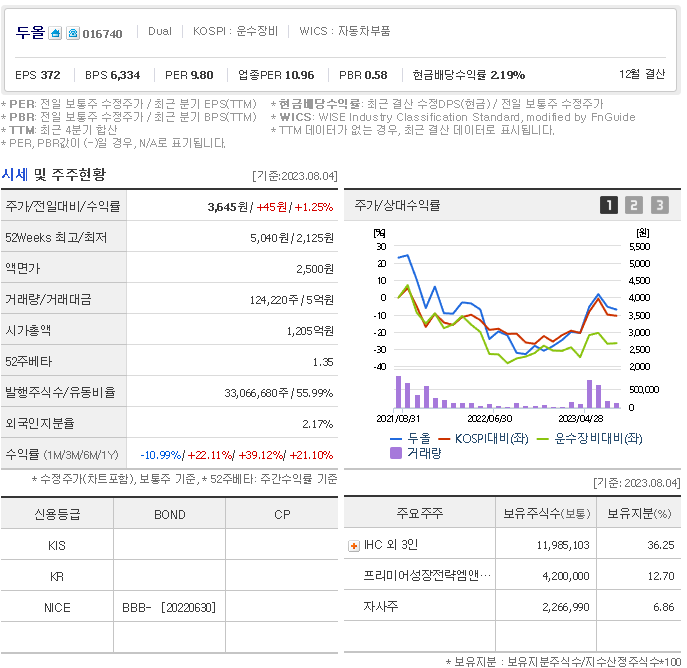 두올 현재 주가는 3,735원이며 전일 대비 -8.79원의 모습을 보이고 있습니다. 두올의 주주현황을 살펴보면 IHC(외 3인)이 지분 36.25%를 소유하고 있습니다. 두올는 자동차부품 기업으로 장중 기준으로 주가는 3,735원 입니다. 두올의 시가 총액은 1205억 원이며 발행 주식수는 2.12주 입니다.