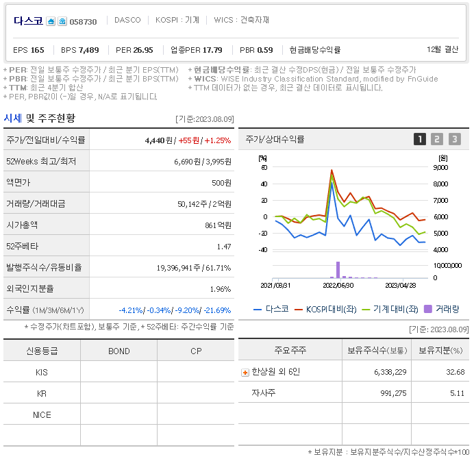 다스코 현재 주가는 4,435원이며 전일 대비 -8.37원의 모습을 보이고 있습니다. 다스코의 주주현황을 살펴보면 한상원(외 6인)이 지분 32.68%를 소유하고 있습니다. 다스코는 건축자재 기업으로 장중 기준으로 주가는 4,435원 입니다. 다스코의 시가 총액은 859억 원이며 발행 주식수는 1.94주 입니다.