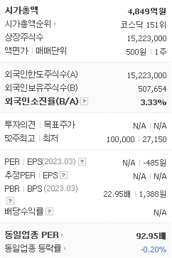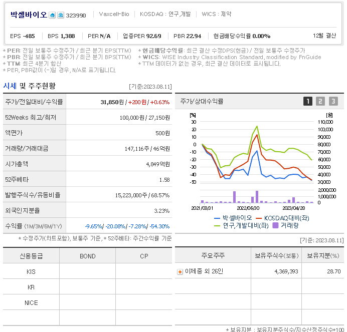 외국인 보유 비중은 398,045% 이며 장중 거래량은 15,223,000를 기록했습니다. 매출액은 억 원, 영업이익은 -82억 원을 달성했습니다. EPS는 없음원이며 박셀바이오 주식 배당수익률은 4,393,985% 입니다.