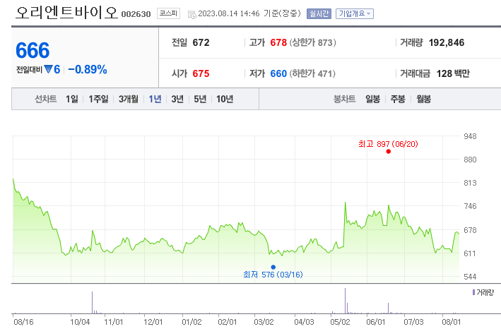 외국인 보유 비중은 167,602% 이며 장중 거래량은 118,583,005를 기록했습니다. 매출액은 288억 원, 영업이익은 -38억 원을 달성했습니다. EPS는 없음원이며 오리엔트바이오 주식 배당수익률은 % 입니다.