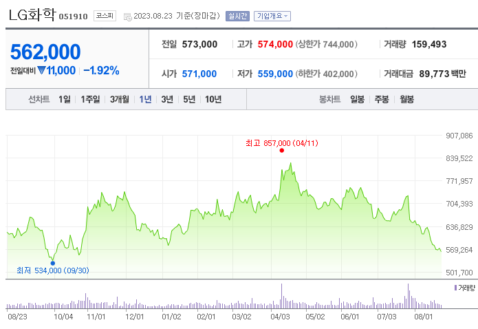 LG화학 현재 주가는 573,000원이며 전일 대비 -17.44원의 모습을 보이고 있습니다. LG화학의 주주현황을 살펴보면 LG(외 2인)이 지분 33.37%를 소유하고 있습니다. LG화학는 화학 기업으로 장중 기준으로 주가는 573,000원 입니다. 삼성전자의 시가 총액은 39조6729억 원이며 발행 주식수는 45.59주 입니다.