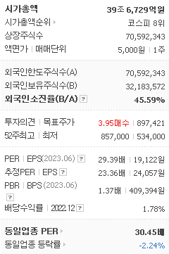 외국인 보유 비중은 186,466% 이며 장중 거래량은 70,592,343를 기록했습니다. 매출액은 290,278억 원, 영업이익은 29,957억 원을 달성했습니다. EPS는 24,057원이며 LG화학 주식 배당수익률은 1.67% 입니다.