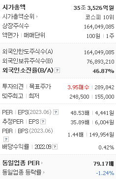 외국인 보유 비중은 1,005,692% 이며 장중 거래량은 164,049,085를 기록했습니다. 매출액은 46,883억 원, 영업이익은 13,047억 원을 달성했습니다. EPS는 6,004원이며 NAVER 주식 배당수익률은 0.51% 입니다.