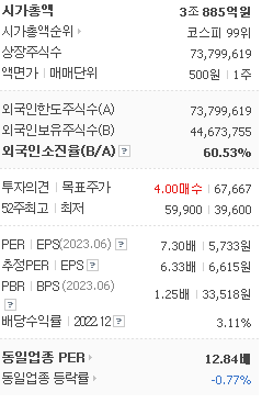 외국인 보유 비중은 121,367% 이며 장중 거래량은 73,799,619를 기록했습니다. 매출액은 19,545억 원, 영업이익은 6,774억 원을 달성했습니다. EPS는 6,615원이며 코웨이 주식 배당수익률은 2.33% 입니다.