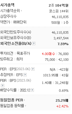 삼성전자의 시가 총액은 2조104억 원이며 발행 주식수는 7.59주 입니다. 외국인 보유 비중은 330,925% 이며 장중 거래량은 46,110,835를 기록했습니다. 매출액은 3,618억 원, 영업이익은 848억 원을 달성했습니다. EPS는 43원이며 롯데에너지머티리얼즈 주식 배당수익률은 1.04% 입니다.