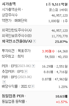 외국인 보유 비중은 224,382% 이며 장중 거래량은 46,957,120를 기록했습니다. 매출액은 40,835억 원, 영업이익은 2,481억 원을 달성했습니다. EPS는 4,716원이며 HL만도 주식 배당수익률은 1.24% 입니다.