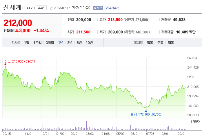 -2023년 3월 전년동기 대비 연결기준 매출액은 11.5% 감소, 영업이익은 6.9% 감소, 당기순이익은 12.1% 감소. 소비 경기 둔화 등으로 의류 매출 성장세가 둔화 및 명품군 성장세의 둔화. 백화점 기존점 성장에도 불구, 제품 믹스와 영업 레버리지 효과 제한에 따른 높은 수익성 하락 가능성 발생. 특별 성과급 지급으로 인한 비용 증가 및 면세점 사업부 매출 감소함.