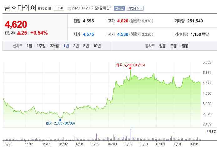 외국인 보유 비중은 244,762% 이며 장중 거래량은 287,260,287를 기록했습니다. 매출액은 20,030억 원, 영업이익은 231억 원을 달성했습니다. EPS는 원이며 금호타이어 주식 배당수익률은 % 입니다.
