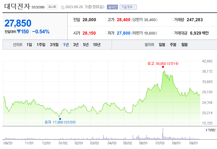 대덕전자 현재 주가는 28,000원이며 전일 대비 -3.95원의 모습을 보이고 있습니다. 대덕전자의 주주현황을 살펴보면 대덕(외 7인)이 지분 32.81%를 소유하고 있습니다. 대덕전자는 전자 장비 및 기기 기업으로 장중 기준으로 주가는 28,000원 입니다. 삼성전자의 시가 총액은 1조3763억 원이며 발행 주식수는 8.83주 입니다.
