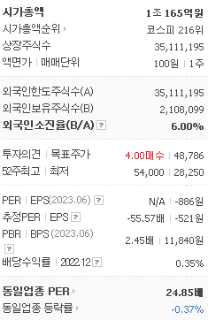 외국인 보유 비중은 55,593% 이며 장중 거래량은 35,111,195를 기록했습니다. 매출액은 2,139억 원, 영업이익은 -452억 원을 달성했습니다. EPS는 -521원이며 솔루스첨단소재 주식 배당수익률은 2.22% 입니다.