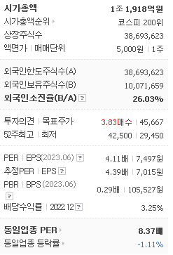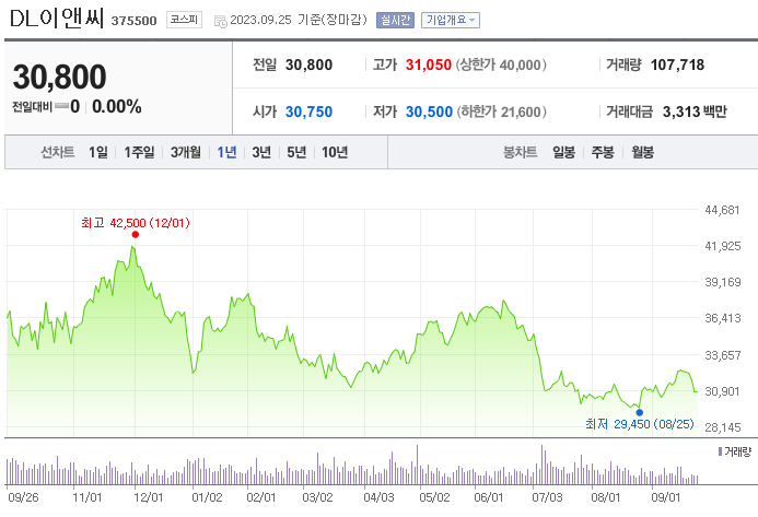 외국인 보유 비중은 104,535% 이며 장중 거래량은 38,693,623를 기록했습니다. 매출액은 38,206억 원, 영업이익은 4,970억 원을 달성했습니다. EPS는 7,015원이며 DL이앤씨 주식 배당수익률은 2.96% 입니다.