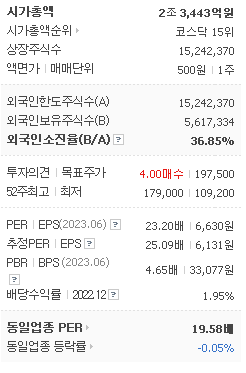 외국인 보유 비중은 70,187% 이며 장중 거래량은 15,242,370를 기록했습니다. 매출액은 1,242억 원, 영업이익은 1,366억 원을 달성했습니다. EPS는 6,131원이며 리노공업 주식 배당수익률은 0.72% 입니다.