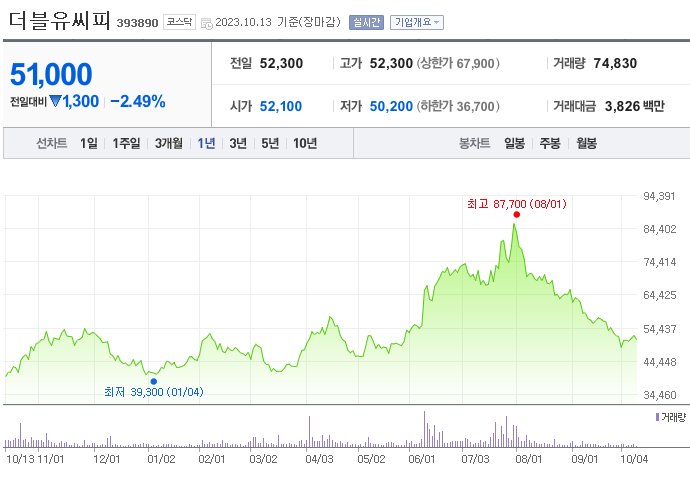 외국인 보유 비중은 75,240% 이며 장중 거래량은 33,696,518를 기록했습니다. 매출액은 1,511억 원, 영업이익은 580억 원을 달성했습니다. EPS는 1,900원이며 더블유씨피 주식 배당수익률은 % 입니다.