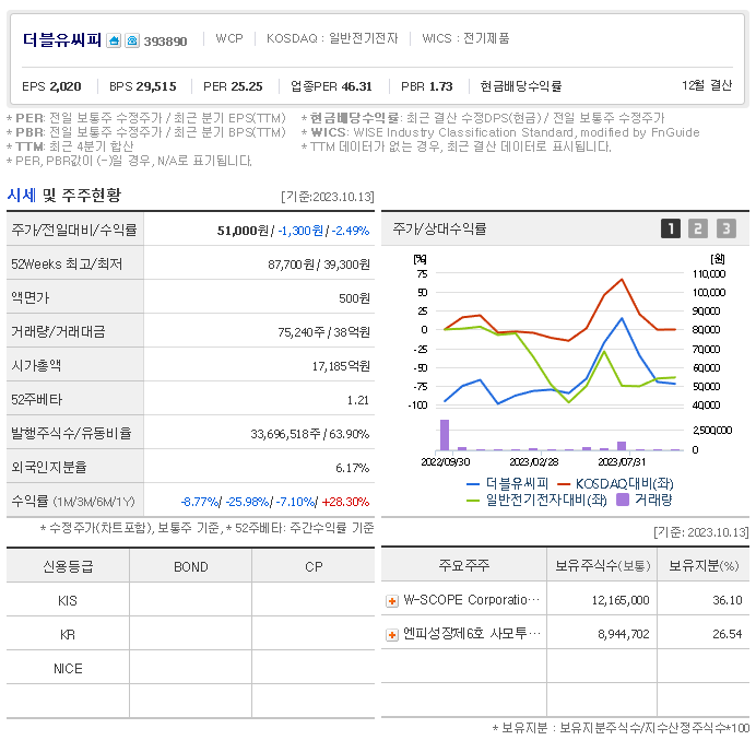 더블유씨피 현재 주가는 51,000원이며 전일 대비 -1,300원의 모습을 보이고 있습니다. 더블유씨피의 주주현황을 살펴보면 W-SCOPE Corporation(외 1인)이 지분 36.10%를 소유하고 있습니다. 더블유씨피는 전자 장비 및 기기 기업으로 장중 기준으로 주가는 51,000원 입니다. 삼성전자의 시가 총액은 1조7185억 원이며 발행 주식수는 6.16주 입니다.