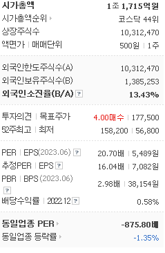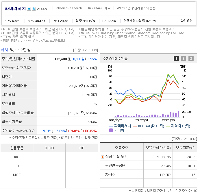 외국인 보유 비중은 225,684% 이며 장중 거래량은 10,312,470를 기록했습니다. 매출액은 1,222억 원, 영업이익은 659억 원을 달성했습니다. EPS는 7,052원이며 파마리서치 주식 배당수익률은 0.96% 입니다.