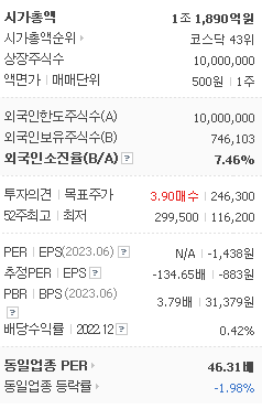 외국인 보유 비중은 38,324% 이며 장중 거래량은 10,000,000를 기록했습니다. 매출액은 943억 원, 영업이익은 565억 원을 달성했습니다. EPS는 -743원이며 천보 주식 배당수익률은 12,050% 입니다.