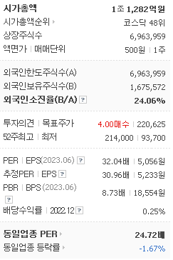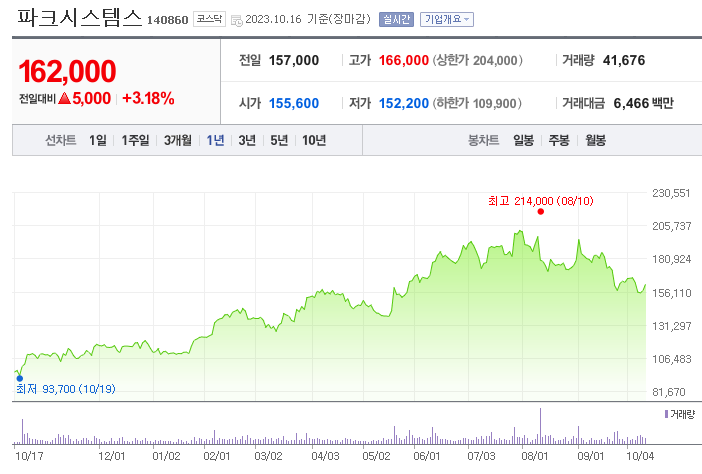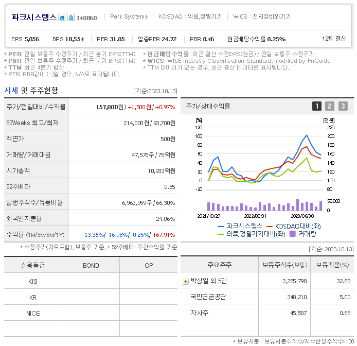 외국인 보유 비중은 47,578% 이며 장중 거래량은 6,963,959를 기록했습니다. 매출액은 669억 원, 영업이익은 326억 원을 달성했습니다. EPS는 5,233원이며 파크시스템스 주식 배당수익률은 0.72% 입니다.