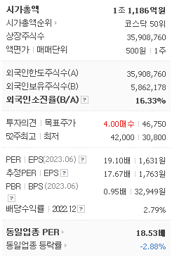 외국인 보유 비중은 87,267% 이며 장중 거래량은 35,908,760를 기록했습니다. 매출액은 7,954억 원, 영업이익은 1,609억 원을 달성했습니다. EPS는 1,763원이며 에스에프에이 주식 배당수익률은 2.39% 입니다.