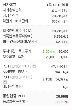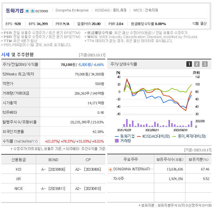 외국인 보유 비중은 206,363% 이며 장중 거래량은 20,215,395를 기록했습니다. 매출액은 4,702억 원, 영업이익은 724억 원을 달성했습니다. EPS는 -1,232원이며 동화기업 주식 배당수익률은 0.72% 입니다.