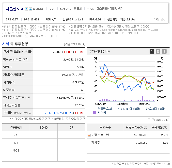서울반도체 현재 주가는 10,450원이며 전일 대비 -8.01원의 모습을 보이고 있습니다. 서울반도체의 주주현황을 살펴보면 이정훈(외 2인)이 지분 28.53%를 소유하고 있습니다. 서울반도체는 디스플레이 및 관련부품 기업으로 장중 기준으로 주가는 10,450원 입니다. 삼성전자의 시가 총액은 6105억 원이며 발행 주식수는 12.81주 입니다.