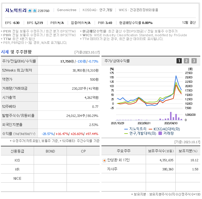 지노믹트리 현재 주가는 17,750원이며 전일 대비 -130원의 모습을 보이고 있습니다. 지노믹트리의 주주현황을 살펴보면 안성환(외 17인)이 지분 18.12%를 소유하고 있습니다. 지노믹트리는 의료 장비 및 서비스 기업으로 장중 기준으로 주가는 17,750원 입니다. 삼성전자의 시가 총액은 4173억 원이며 발행 주식수는 2.53주 입니다.